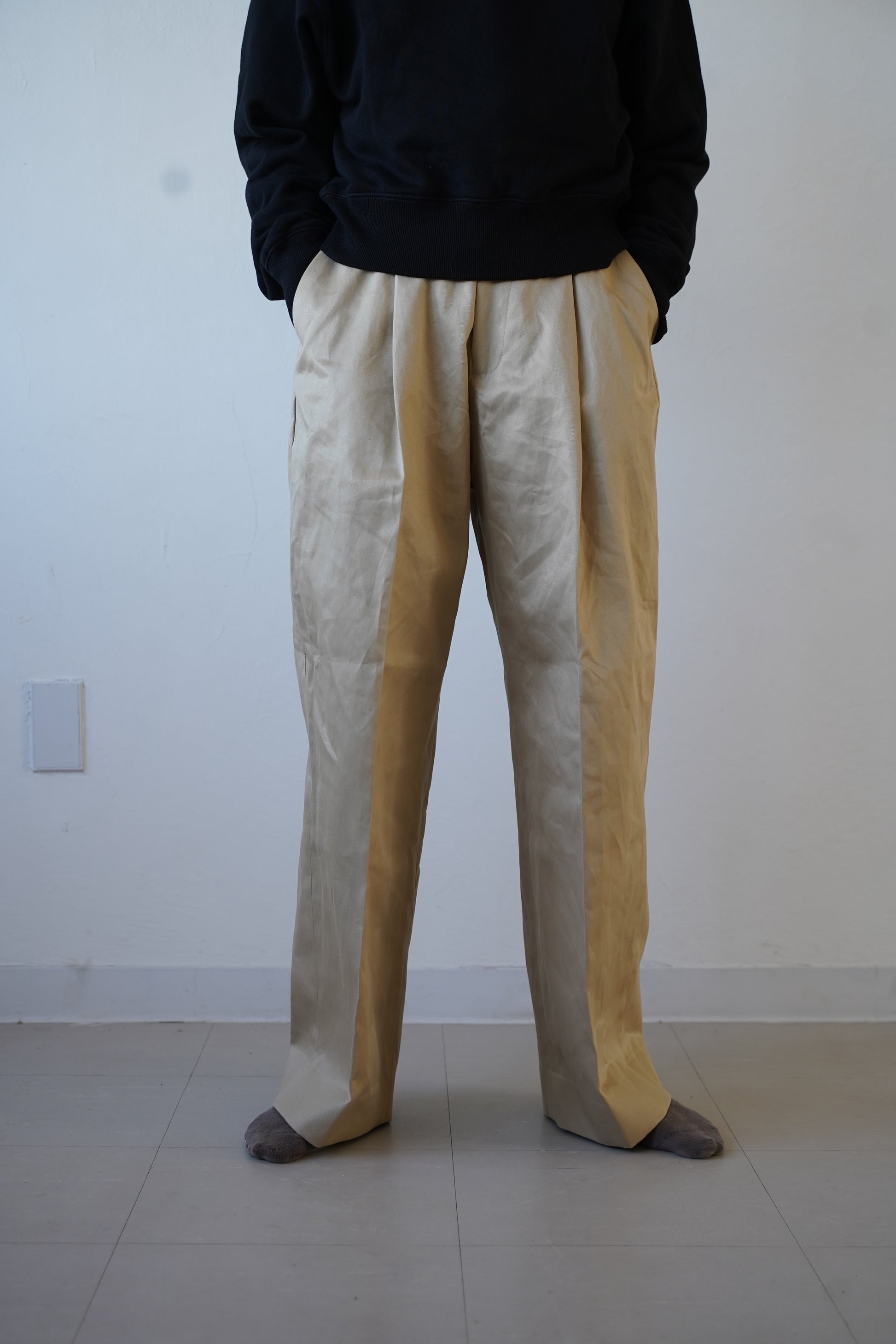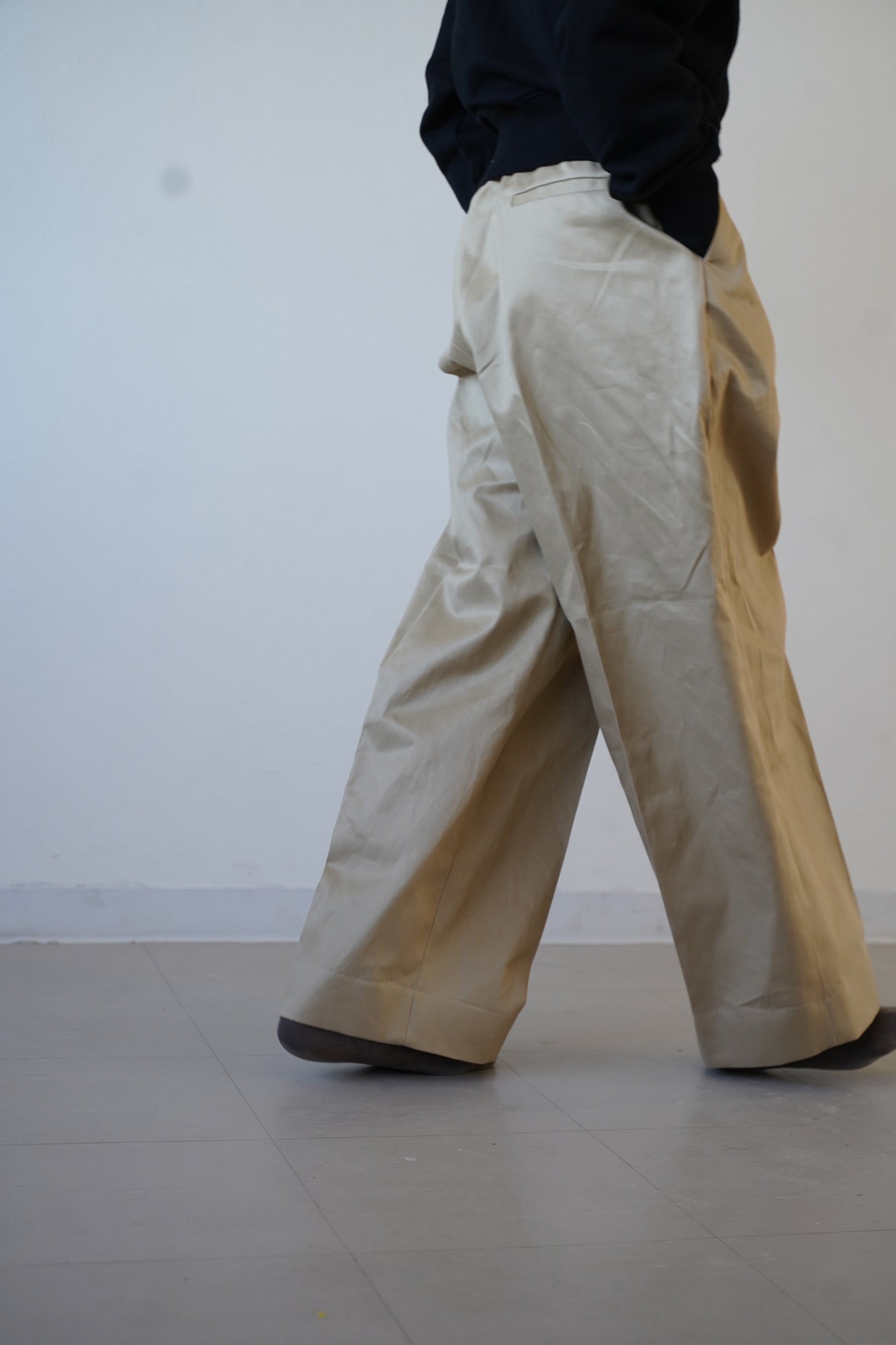 Urizum オリジナルとしては初めてのパンツです。デザインとしては大きめなワンタックが入ったワイドチノです。2サイズの展開で、できるだけ幅広い方に履いて貰いたいので、ウエストをゴムにし、サイズに幅を持たせてます。生地は岡山の菱友さんの生地を使用しております。36/2高密度ウエポンというとても綺麗で尚且つ強い生地です。通常のチノクロスは単糸を使うのですが、こちらの生地は双糸という2本の糸を撚って作っているため、強度が高く、頑丈な生地です。また36番手という細かい糸を使用しているので、滑らかできめの細い生地なのも特徴の一つです。上品な光沢感にハリがある素晴らしい素材です。また生産工場も名古屋の名東区にあるファッションコニシさんで生産を行なっています。細かい縫製や無駄のない運針はデザインの一部となっております。パンツはファッションのベースを作ります。そして良いパンツは長持ちします。そして頑丈な作りのものはリペアが可能です。是非、長く履き、愛着とともに経年変化を楽しんで頂けたら嬉しいです。sizeですが2サイズあり、性別関係なくウエスト周りの大きさで選択していただければ幸いです。